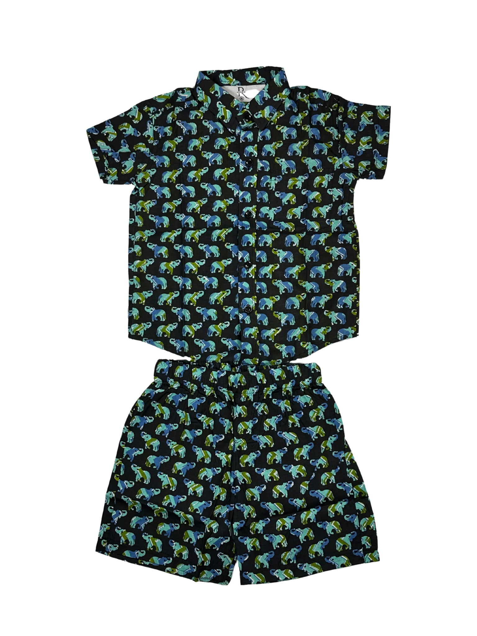 Let your child stand out in this vibrant elephant print co-ord set, designed for both comfort and style! Featuring a short-sleeve button-down shirt and matching elasticated shorts, this set is perfect for casual outings, vacations, or playful days at home. The bold and colorful elephant print adds a fun touch, while the soft, breathable fabric ensures maximum comfort.