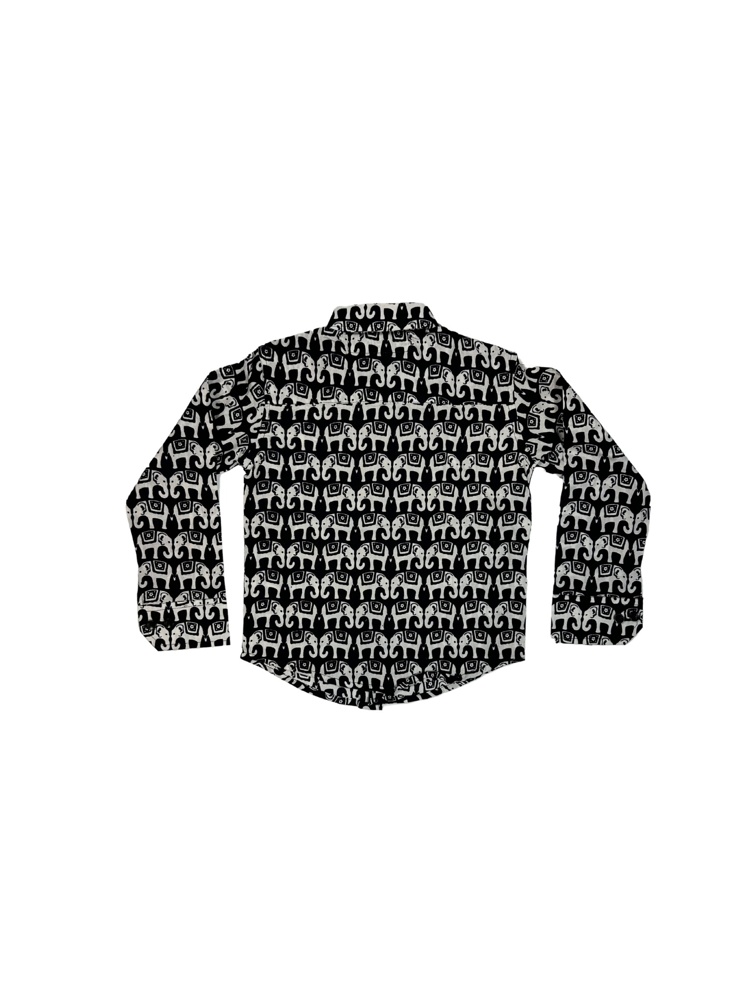 Make a bold fashion statement with this charming elephant print boys' shirt. Featuring a striking black-and-white elephant pattern, this full-sleeve shirt is designed for both casual and special occasions. Crafted from soft and breathable fabric, it ensures all-day comfort while maintaining a stylish look. The button-down front and classic collar add a refined touch, making it a versatile addition to any young boy’s wardrobe.