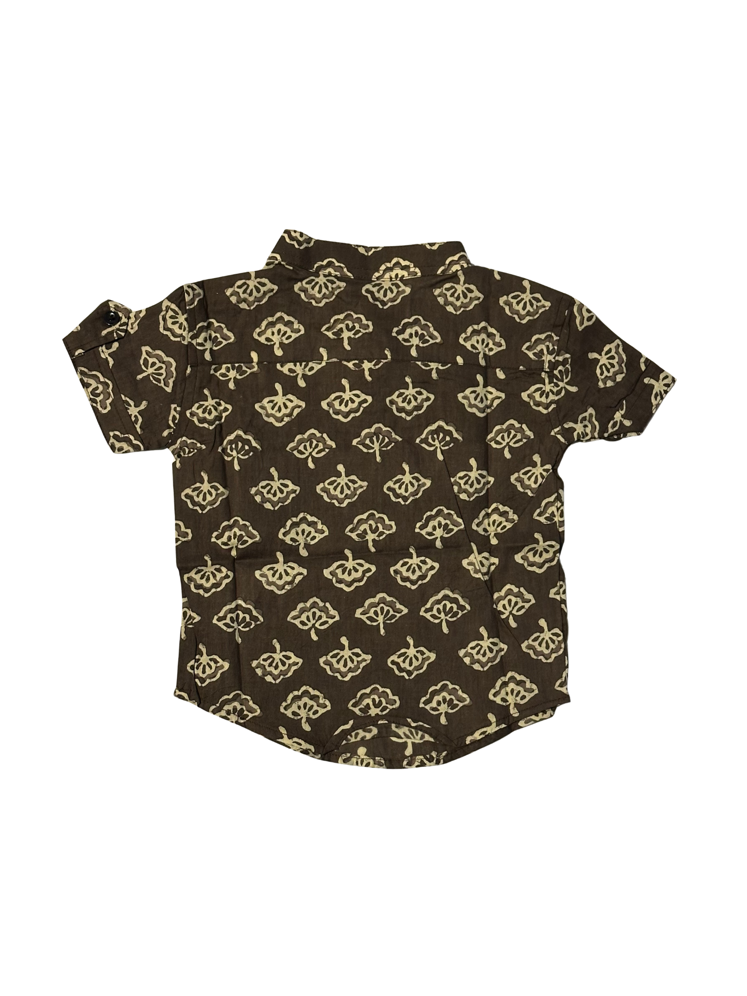 Let your little one stand out in this stylish brown hand-block printed shirt! Crafted from soft, breathable cotton, this shirt features a unique traditional print in a soothing cream tone. The half sleeves and mandarin collar give it a trendy yet classic vibe, perfect for casual outings, festive gatherings, or cultural celebrations. The button-down front makes it easy to wear and adds a touch of charm to your kid’s wardrobe.