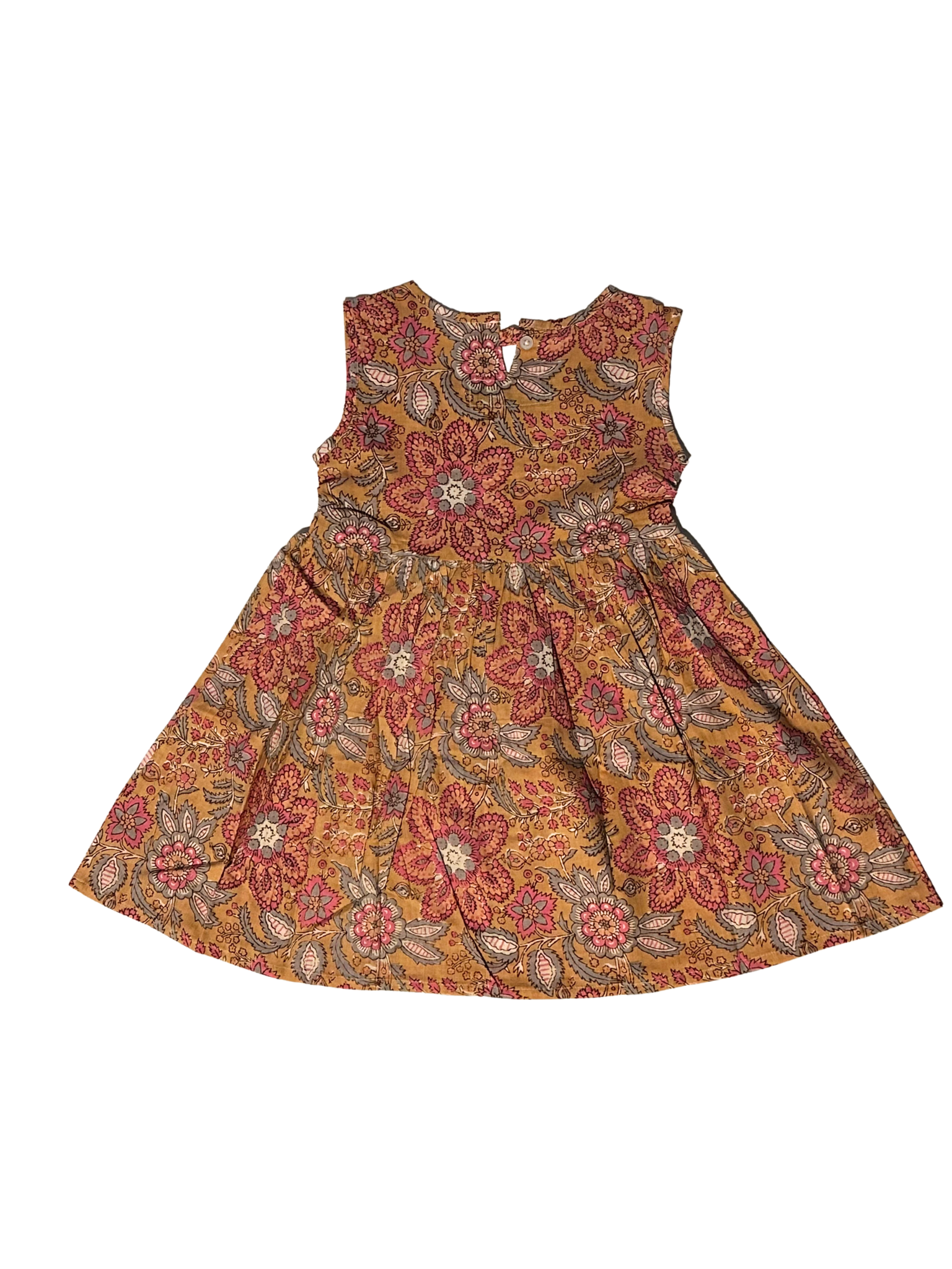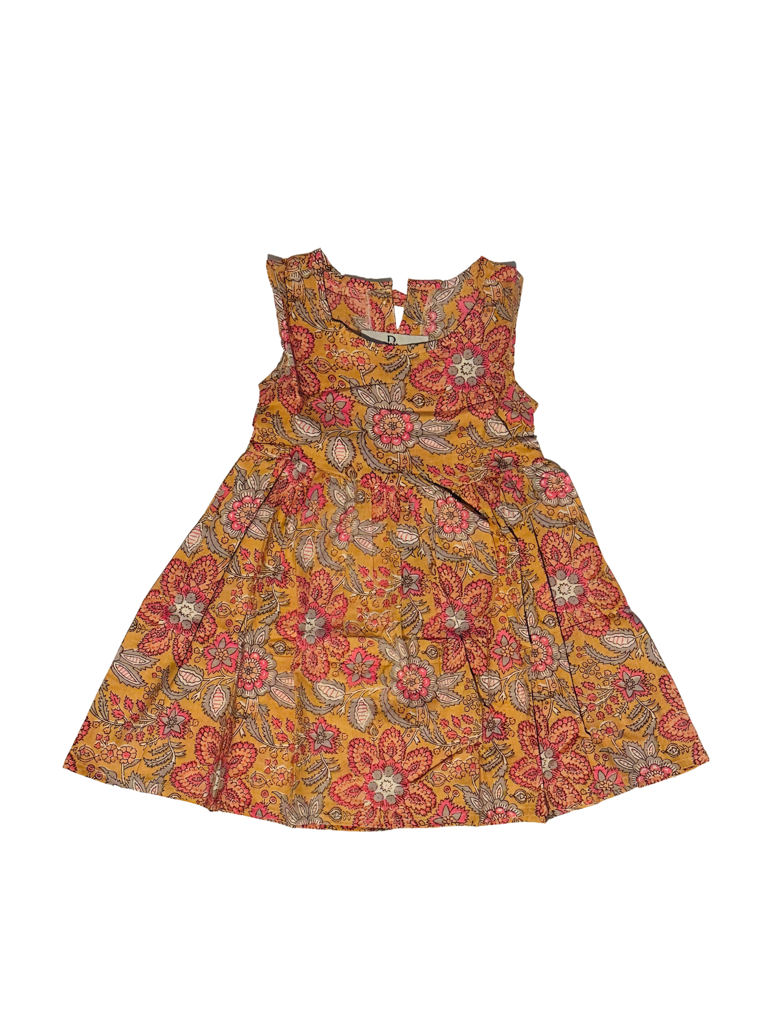 Brighten up your little one’s wardrobe with this charming sleeveless floral dress! Made from soft, breathable cotton, this dress features a vibrant mustard base with intricate pink, red, and grey floral patterns, perfect for sunny days and special outings. The pleated waist and flared skirt add a touch of elegance, while the back button closure ensures easy dressing and a snug fit.