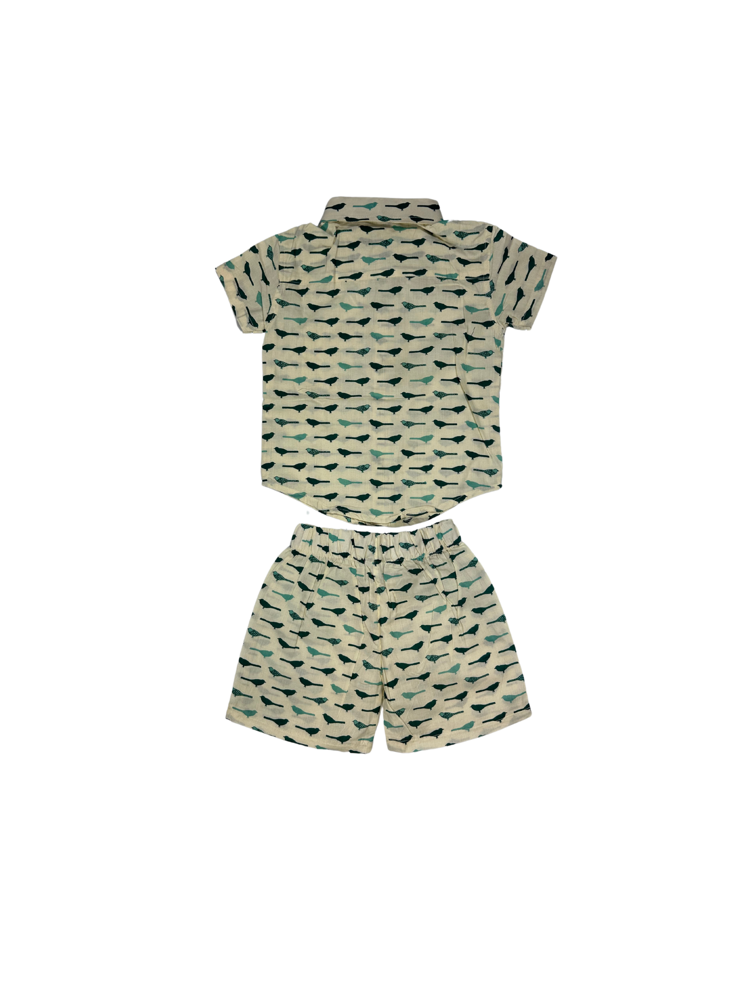 Make a splash with this adorable pigeon print co-ord set, perfect for little ocean lovers! Designed with a fun and stylish pigeon, this matching short-sleeve button-up shirt and elastic-waist shorts combo is both comfortable and trendy.